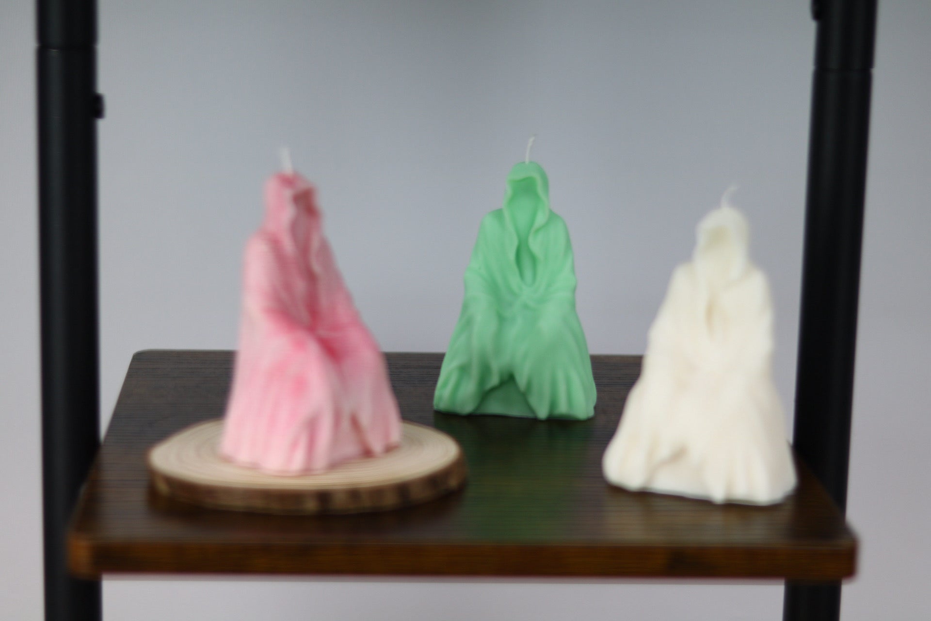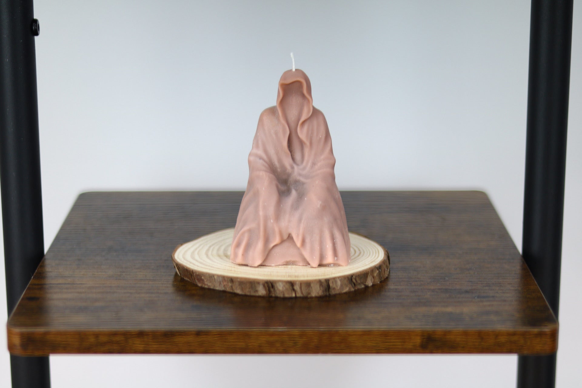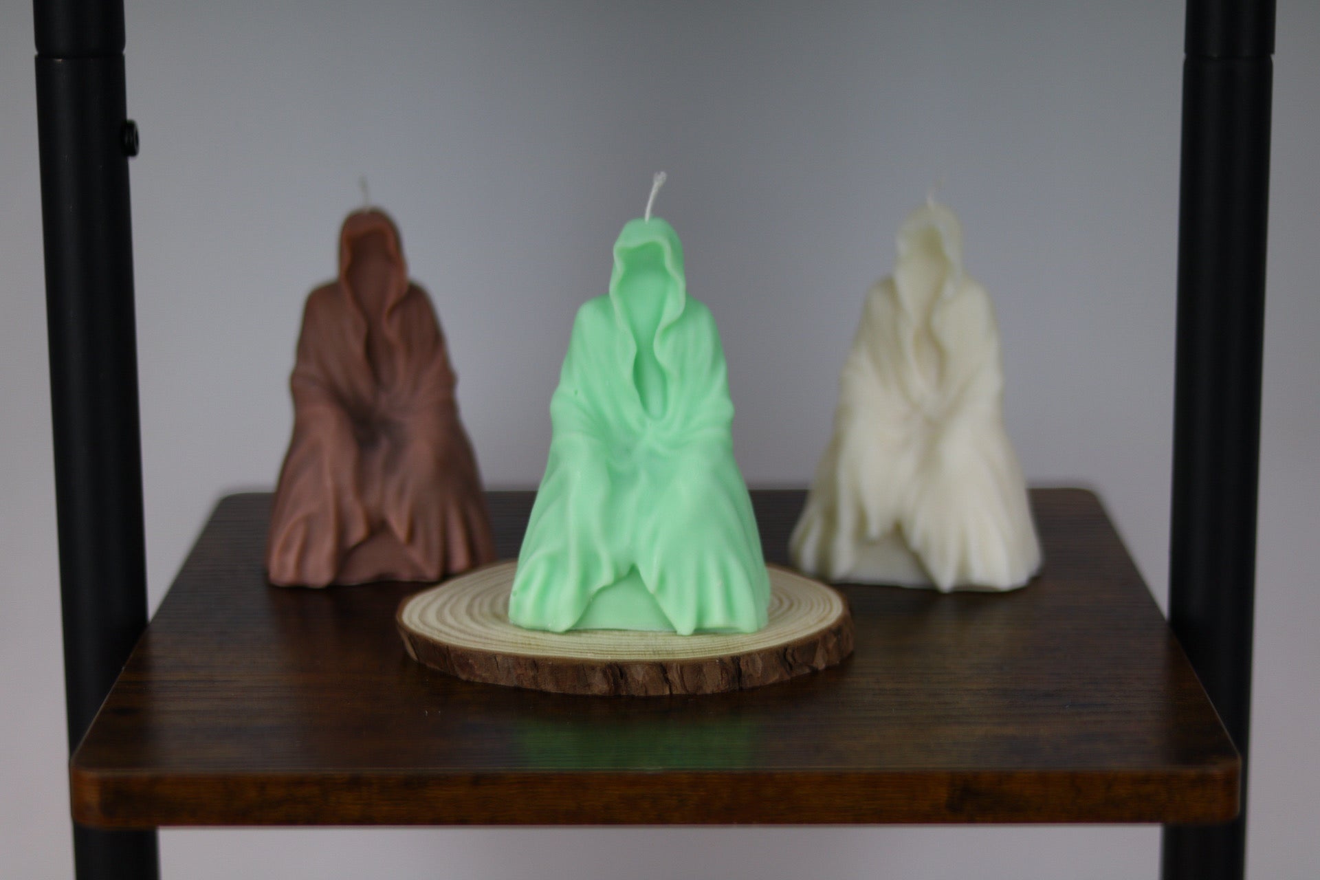 Carefully hand-poured and crafted to perfection, this candle features a captivating scent that fills any space. It creates a warm and inspiring atmosphere.Hand Poured Ghost Hooded Clocked Man Scented Candle - prefect gift for any occasion